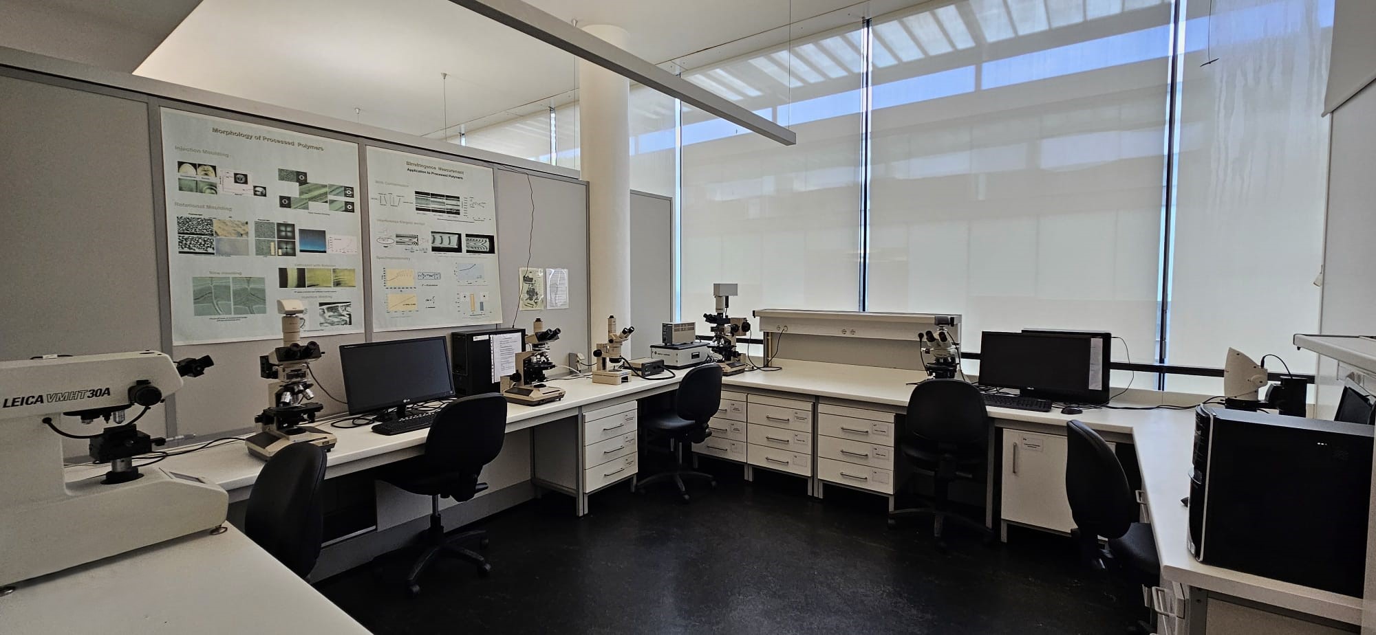 The microscopy lab is dedicated to the characterization of optical and morphological properties of polymers. It supports the training of students in the areas of characterization and quality control, through the identification of product characteristics, defects and their causes, structural analysis of polymeric compounds or composites and morphological studies of semi-crystalline polymers. It is equipped with different sample preparation and characterization techniques.
